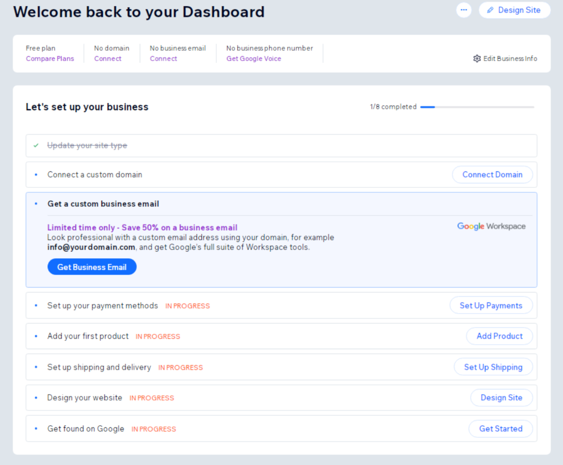 Completing these setup steps ensures your Wix store is optimized, functional, and ready to sell products online. Once everything looks good, upgrade to a paid Wix plan to enable ecommerce features and start accepting payments.