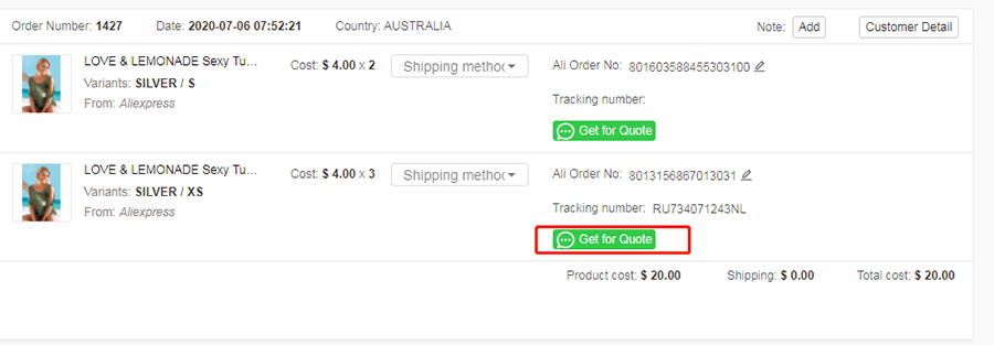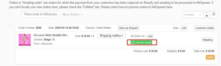 如果速卖通这个产品已经缺少库存或者没有比较快的物流方式,你可以点击”Get for Quote” ,EPROLO报价成功后,点击“Fulfill at EPROLO”,让EPROLO来处理这个订单。
