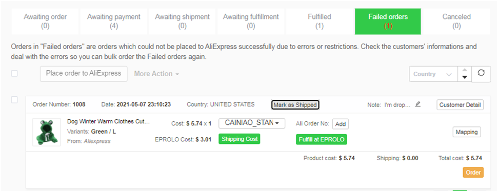 下单失败:你可以根据错误提示查看文章:速卖通订单下单失败处理方法, 然后在“Failed orders”进行重新下单。