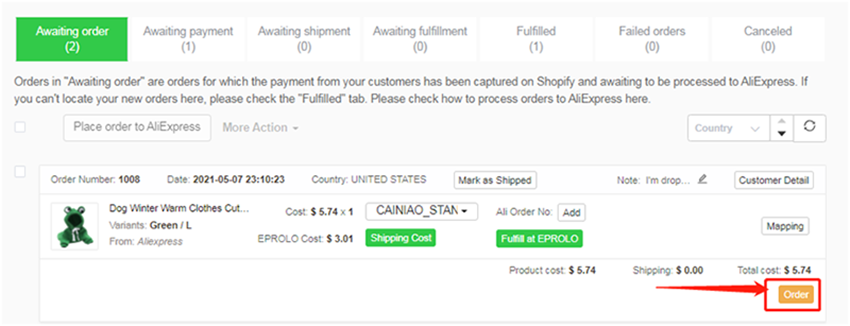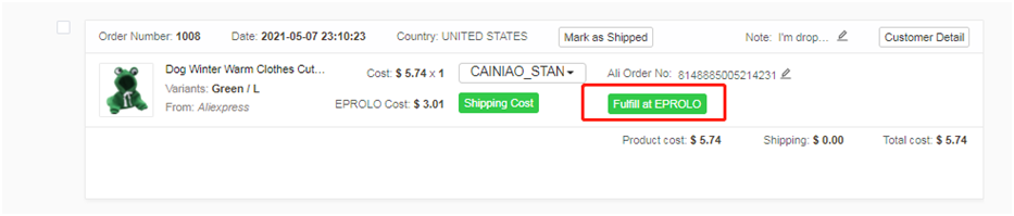 点击 “Fulfill at EPROLO”,你就可以在“Eprolo Orders”付款了。收到您的付款后,我们会立即安排采购,尽快将产品送到您客户的手中。