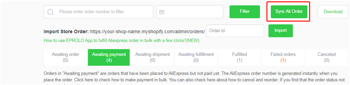 完成授权之后,速卖通产品订单会自动从您的店铺同步到EPROLO后台的“Ali Orders”。如果您发现同步失败,请填写“Order id”,并点击“Import”手动导入订单。