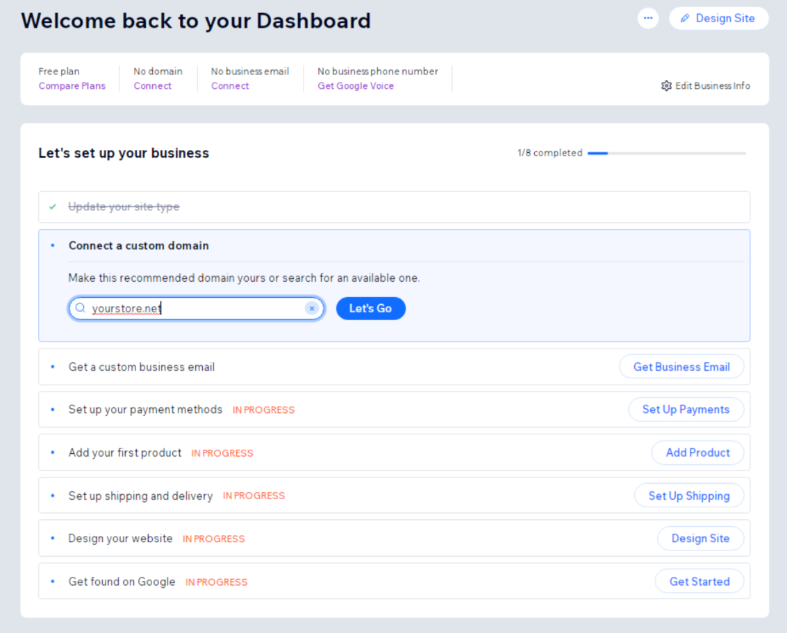 Completing these setup steps ensures your Wix store is optimized, functional, and ready to sell products online. Once everything looks good, upgrade to a paid Wix plan to enable ecommerce features and start accepting payments.